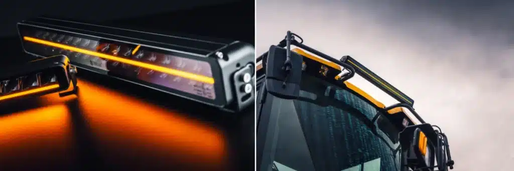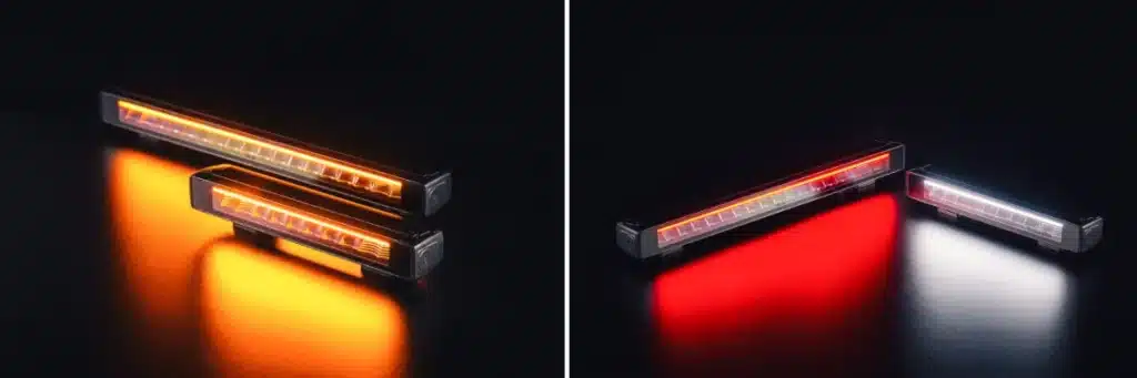 - Duo-color DRL: rood/amber (RA-variant) voor achterzijde (rood als achterlicht, amber als knipperlicht) en wit/amber (WA-variant) voor voorzijde – zorgt voor uniforme, professionele uitstraling over het hele voertuig.