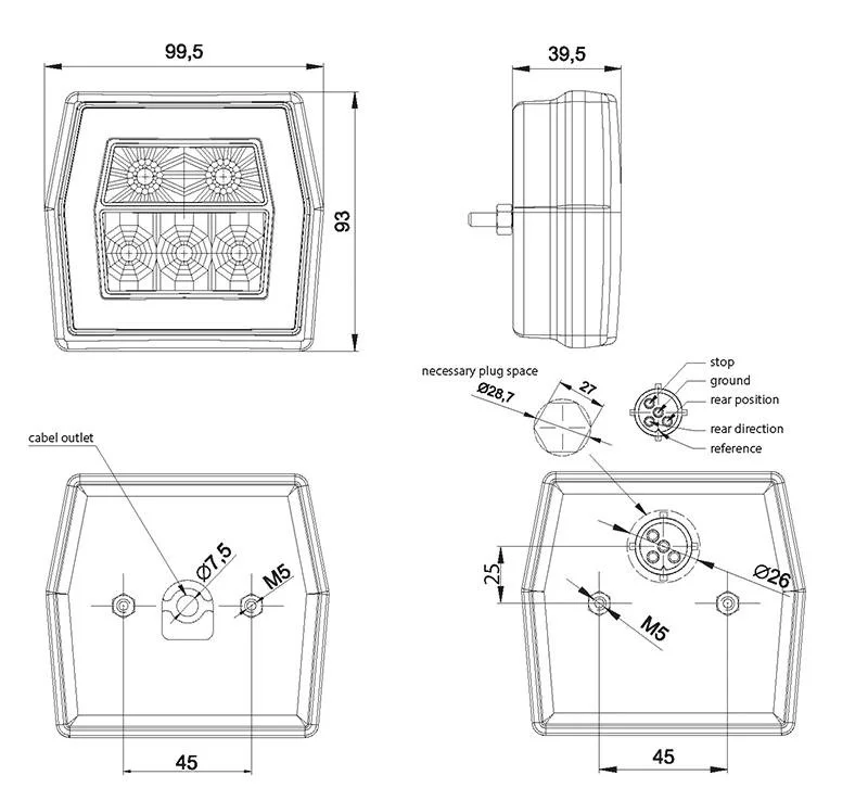 Het model V10C3-720 is voorzien van een behuizing en lens uit polycarbonaat en is geschikt voor opbouwmontage. Dankzij de IP68-classificatie is dit achterlicht volledig stof- en waterdicht. Met CE, ECE-R10, ECE-R7 en ECE-R6 certificeringen voldoet het aan alle relevante voertuig- en elektromagnetische compatibiliteitsnormen.