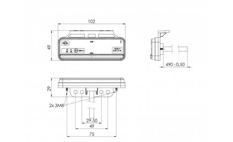 Met een IP68-classificatie is dit LED markeringslicht stof- en waterdicht. Daarnaast voldoet het aan de CE-, ECE-R10-, ECE-R3- en ECE-R91-richtlijnen, wat het product geschikt maakt voor gebruik op de openbare weg. De compacte afmetingen van 102x46x16 mm zijn afgestemd op een gestroomlijnde integratie in uiteenlopende voertuigtypes.