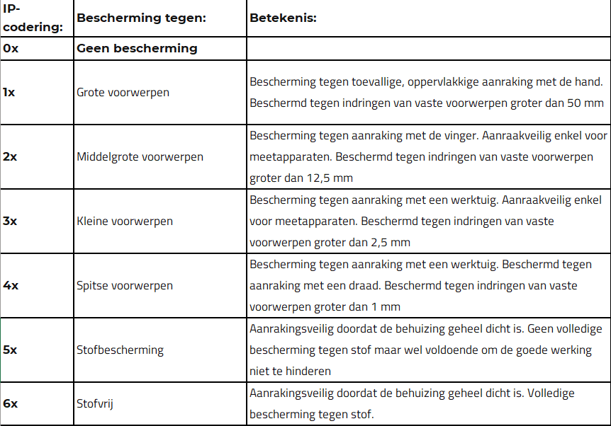 Het eerste getal staat voor de mate van bescherming tegen vaste materie zoals stof, met getallen van 0 tot 6, waarbij 6 het hoogste beschermingsniveau biedt.